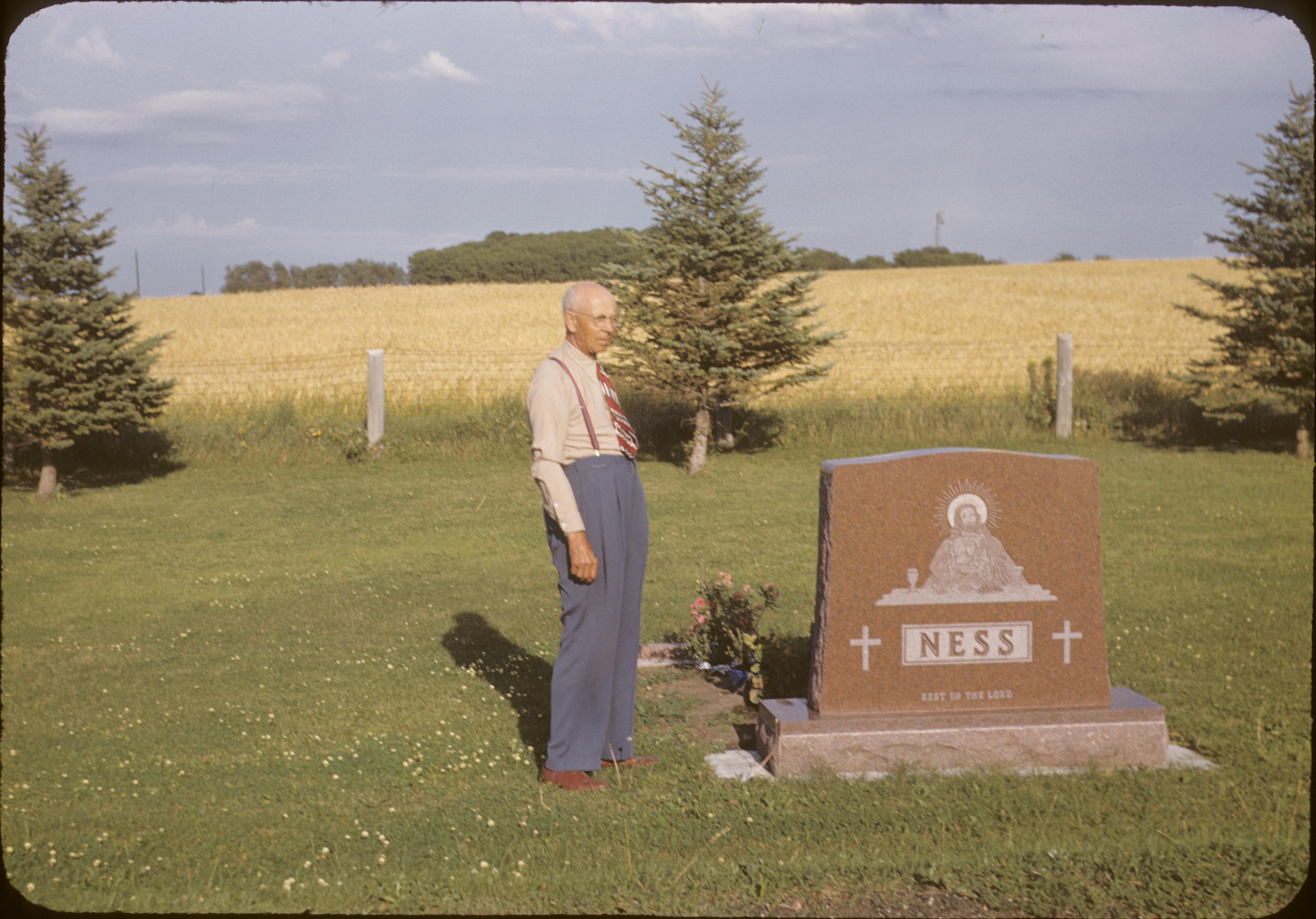 Year: 1950.Location: Starbuck MN.Subject: Grandpa Ness at Starbuck graveyard; Ness family at beach.