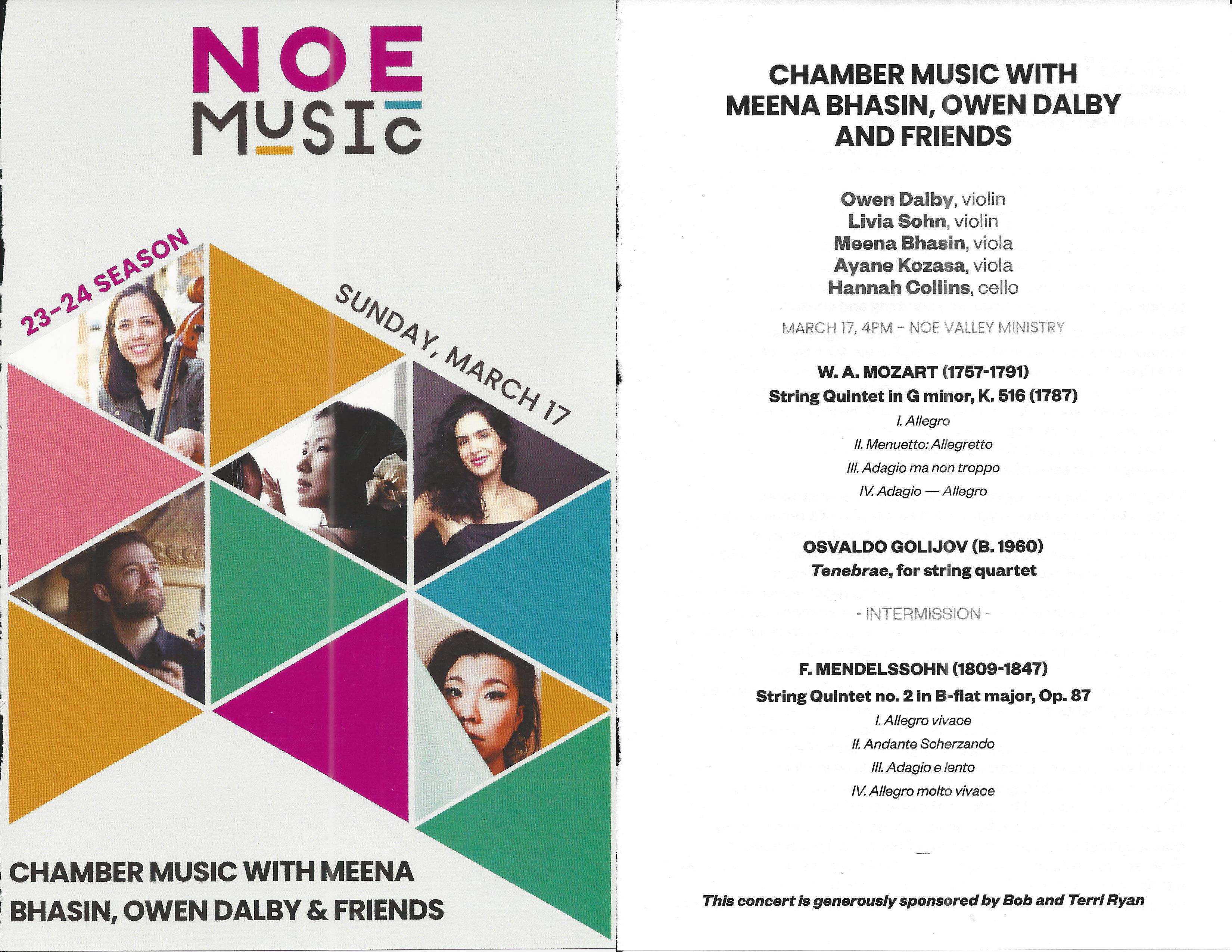 | 03/17/24 @ 16:00 | Chamber | Noe Music | Meena Bhasin, Owen Dalby & Friends | Noe Valley Ministry | San Francisco | Program | Mozart: String Quintet, K. 516 Golijov: Tenebrae Mendelssohn: String Quintet No. 2 |