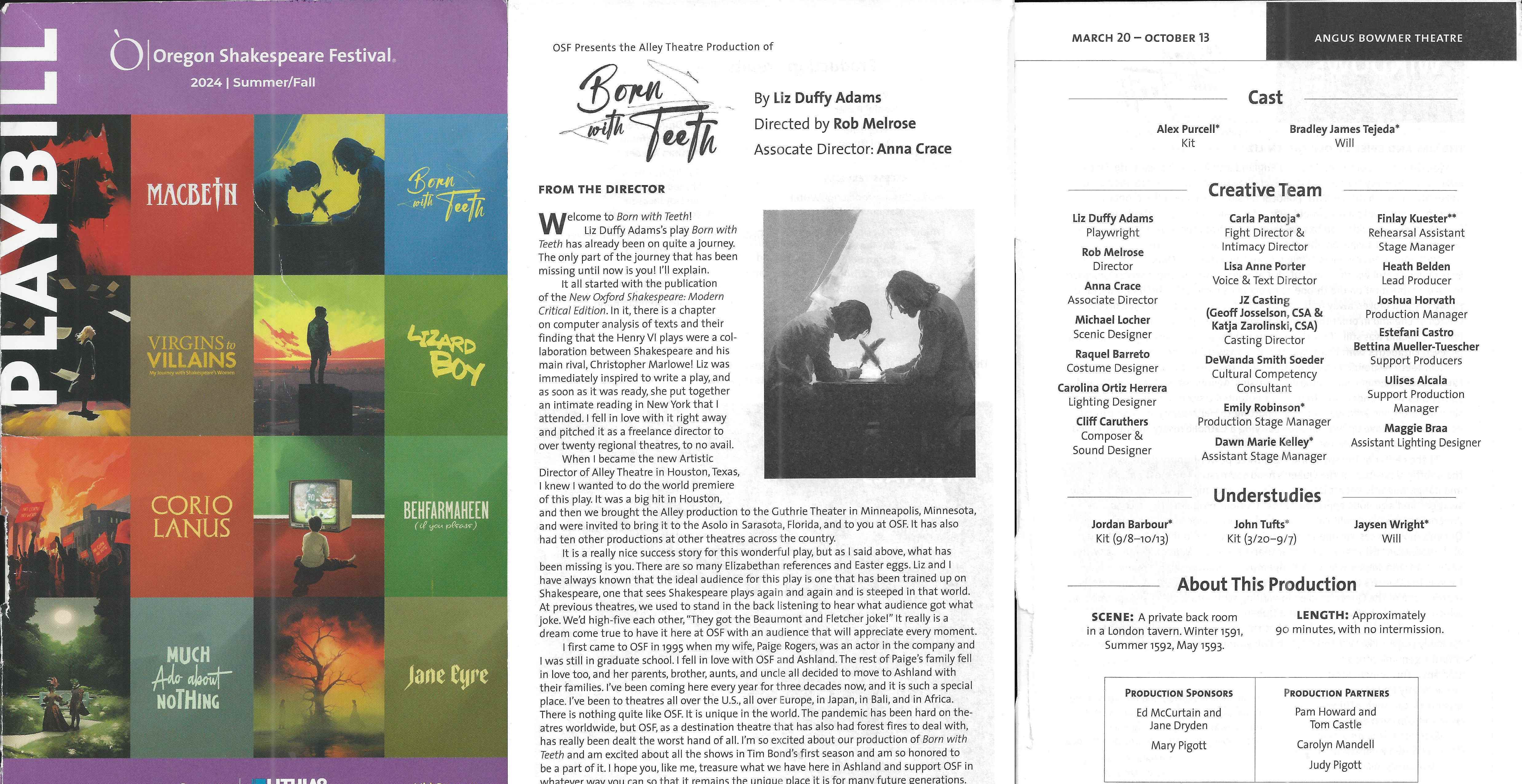 | 09/04/24 @ 13:30 | Theater | Born with Teeth | Oregon Shakespeare Festival | Bowmer | Ashland OR | Program | Adams, L. D.: Born with Teeth | |||