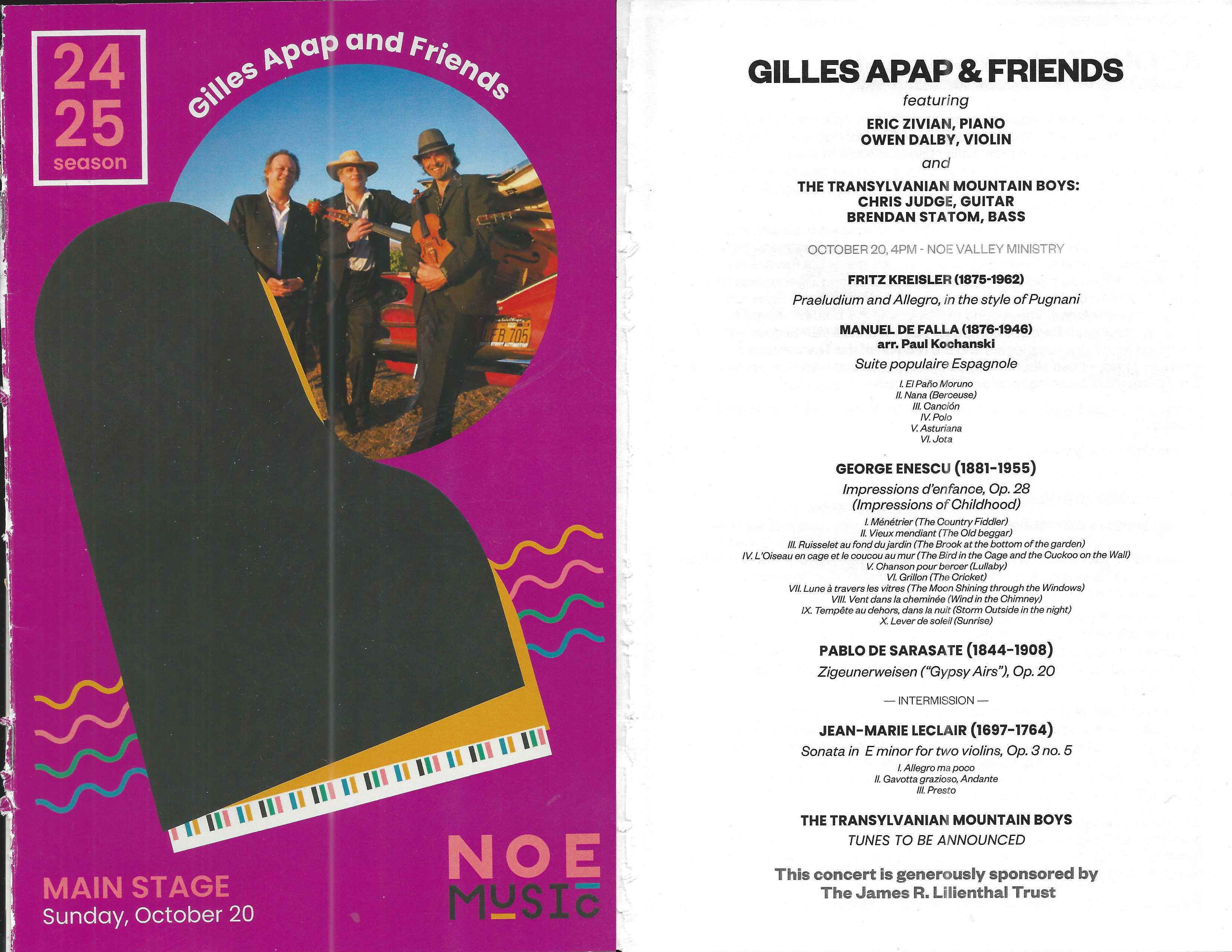 | 10/20/24 @ 16:00 | Chamber | Noe Music | Gilles Apap, violin | Noe Valley Ministry | San Francisco | Program | ||||
