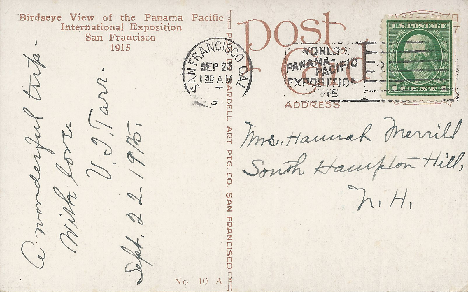 - Bardell 10 (postmarked S.F. 9/23/1915, P.P.I.E. cancellation) is a closer bird's-eye-view looking northeast.