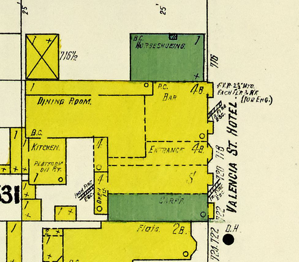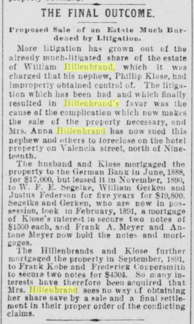Newspaper articles record the rocky early history of the hotel. Philip Klose brought 15-year-old William Hillenbrand, the son of a friend, from Germany in 1874. Lacking other heirs, Klose treated Hillenbrand like an adopted son, and from 1880 they were business partners in the Turk St. Hotel. In 1888 they began to build a hotel on Valencia, but Klose became gravely ill. Hillenbrand convinced Klose to deed his property to Hillenbrand, to be recorded after Klose's death, then Hillenbrand recorded the deed and transfered the property to his wife. Klose recovered from his illness and sued Hillenbrand to regain his property, winning the suit (eventually in the state Supreme Court). Further litigation followed, with Hillenbrand retaining some interest in the Valencia property. Widow Clara M. Frank owned the property from 1893 until 1907.