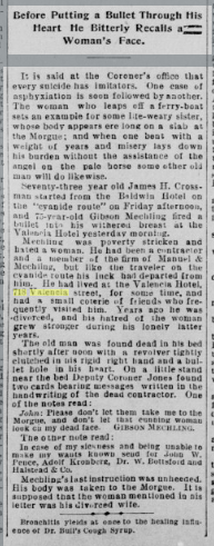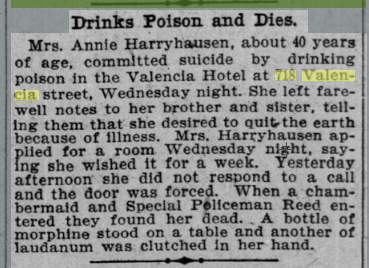 The Valencia St. Hotel advertised only occasionally (above: Call 05/31/1901). The hotel looked for a lot of workers around 1900 (Call: 05/13/1900 [waiter], 06/23/1900 [kitchen man], 09/06/1900 [chambermaid], 09/14/1900 [cook], 07/07/1901 [barber/tailor], 01/24/1902 [upstairs girl]). And it probably needed a new cook after the cook pulled the proprietor's whiskers (Call 02/15/1898). Residents sought employment (Call 06/20/1890, 02/21/1896, 07/21/1900), committed burglary (Chronicle 03/17/1892), went crazy (Alta 05/05/1891), died accidentally (Chronicle 10/29/1904), committed suicide (Call 04/11/1893 [jumping out window], 10/08/1894 [gunshot], 11/08/1901 [poison], 07/04/1902 [knife; see suicide note above]). The 1900 U.S. Census lists residents as roughly 20% California-born, 20% other US-born, 60% immigrants, with most immigrants German/Austrian/Swiss. The hotel employed and housed many Germans.