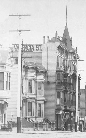 This photo ca. 1898 looks north on Valencia from 19th, with the Valencia St. Hotel mid-block on the west side. It's the only pre-quake photo of the hotel that I've seen. A Valencia line streetcar (Ferry Building / Market / Valencia / Mission) heads toward downtown from 18th. The utility poles and the gaslight in front of the hotel are useful positioning aids in comparisons with later photos.