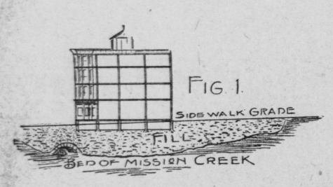 The blocks around 17th/Mission formed a shallow basin, once a marshy seasonal wetland fed by Mission Creek. Low spots were filled haphazardly as the city grew (see Burrito Justice for a detailed discussion), and the filled areas did not fare well in the earthquake. Liquefaction contributed to the Valencia St. Hotel collapse and the earthquake ruptured the big Valencia water mains, leading to large sinkholes. Just five days after the quake, the Chronicle 04/23/1906 reports on "Curious Freaks of the Earthquake" along Valencia. Two months after the quake, Call 06/24/1906 discusses the Valencia St. Hotel structural failure in considerable detail (diagrams above). Serious damage followed the former path of the creek to the east along 18th Street, as seen on my Drunken Houses page.